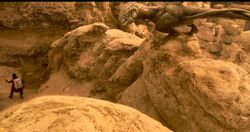 Meanwhile, her father, John, was assigned to repair a well on the planet, but became trapped inside and injured due to the effects of a rust virus that was breaking down metal on the planet. Learning of his predicament by radio, she planned to come to treat him, but he was many miles away. She was only able to travel a short distance in a Chariot vehicle before it too broke down. Fortunately, she was a former All State track runner and decided that she would run the distance, no matter what it took. She made her way across the planet's forbidding desert, evading attacking dinosaurs along the way. On the journey, she remained in communication with her father, warning him to not give up, as the family would fall apart without him. Determined, she finally reached him and succeeded in treating him and saving his life. ("Run")